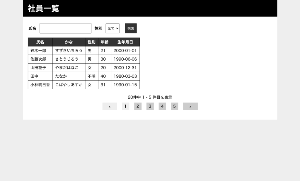 検索結果が5件を超えた場合、以下のように 1ページ5件ずつのページング表示されるようにしてください。