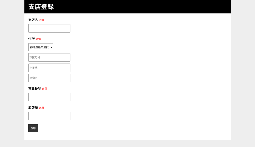 LESSON 8 : 復習 他 データベースに支店マスタを追加し、以下のように一覧画面・登録画面・編集画面を作成してください。 ただし、一覧画面は「並び順」が小さい順に並ぶものとします。また、電話番号には、適切なバリデーションを施してください。