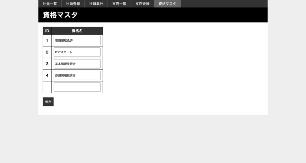 LESSON 17 : 複合的な削除 資格マスタ画面の仕様を以下のように変更してください。 既存の行の必須チェックを外す。既存の行を空白にして保存した場合、対象の資格は削除される。資格が削除された際、その資格をもつ社員が存在した場合、これらの社員のデータも、その資格を持っていなかった状態に更新される。 (画面は変更なし)