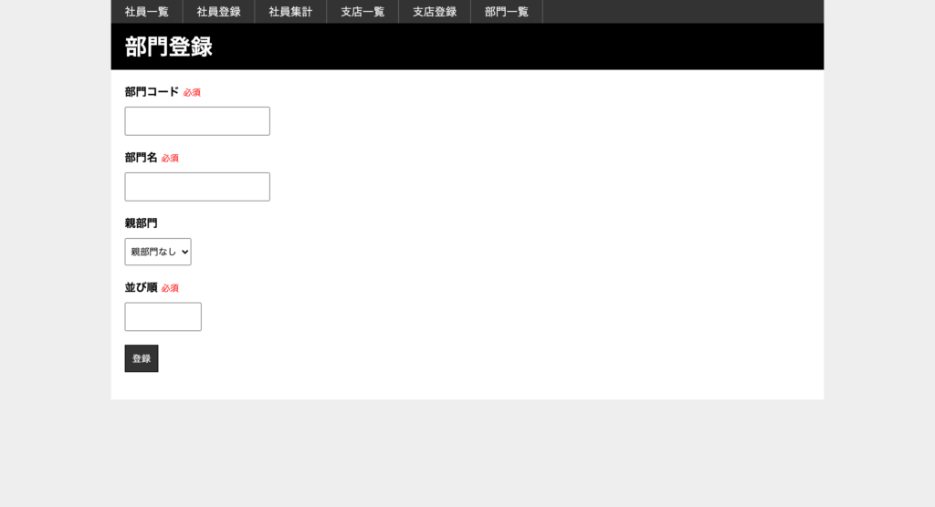 LESSON 24: 複雑なリレーション (1) データベースに部門マスタを新規作成し、一覧、登録、編集画面を実装してください。 部門一覧は「並び順」昇順で表示される。部門コードは重複不可。「親部門」は、部門マスタのレコードのうち1件を選択するが、自身を選択することはできない。