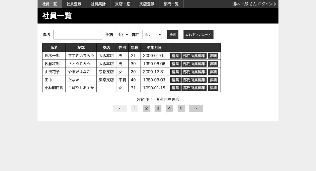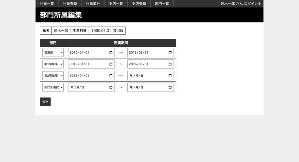 LESSON 25 : 複雑なリレーション (2) 「部門所属編集」画面を新規作成し、社員一覧よりリンクさせてください。 表には過去所属した部門の一覧が表示され、編集が可能。表の末部には空白行が1行表示され、入力した場合は新規登録される。既存の行の部門を未選択にした場合は、該当行が削除される。所属期間は始期(From)が必須、終期(To)は任意